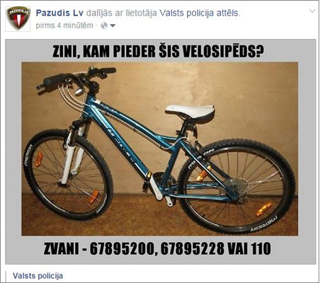 Policija aicina aplūkot attēlā redzamo velosipēdu un gadījumā, ja kāds zina šī velosipēda īpašnieku, zvanīt uz tālruņa numuriem: 67895200, 67895228, 110 vai vērsties Salaspils iecirknī.